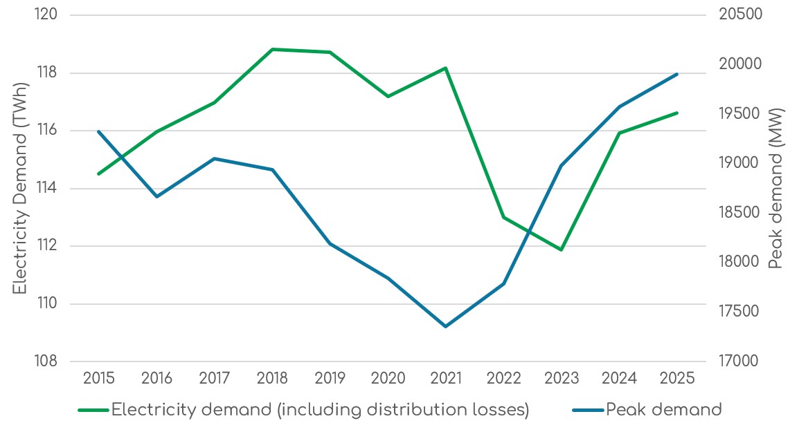 Ontwikkeling van de Nederlandse elektriciteitsvraag (TWh) en piekverbruik (MW)