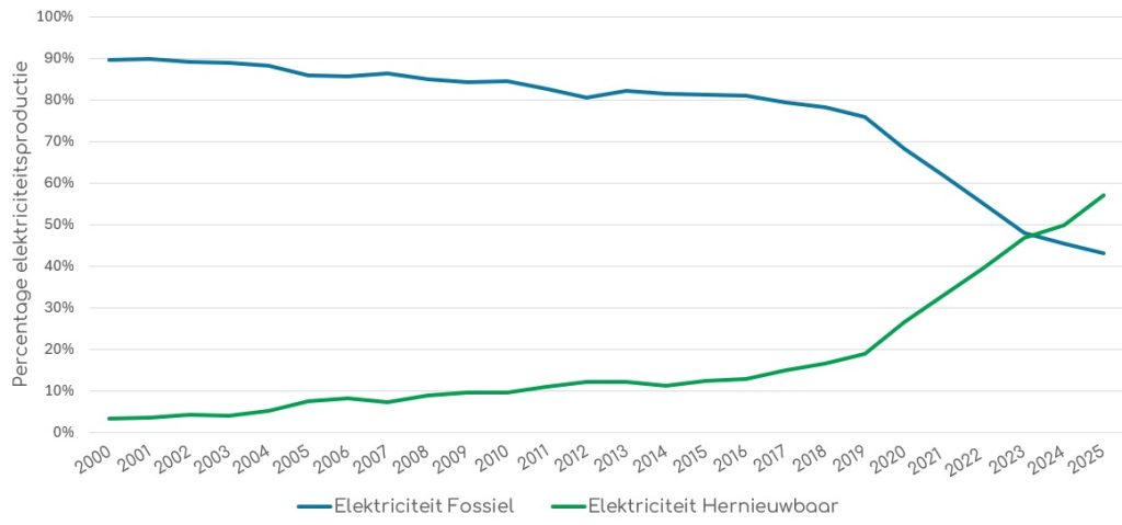 Percentage fossiele en hernieuwbare elektriciteitsproductie in Nederland 2000 – 2025 (2025 voorlopig)